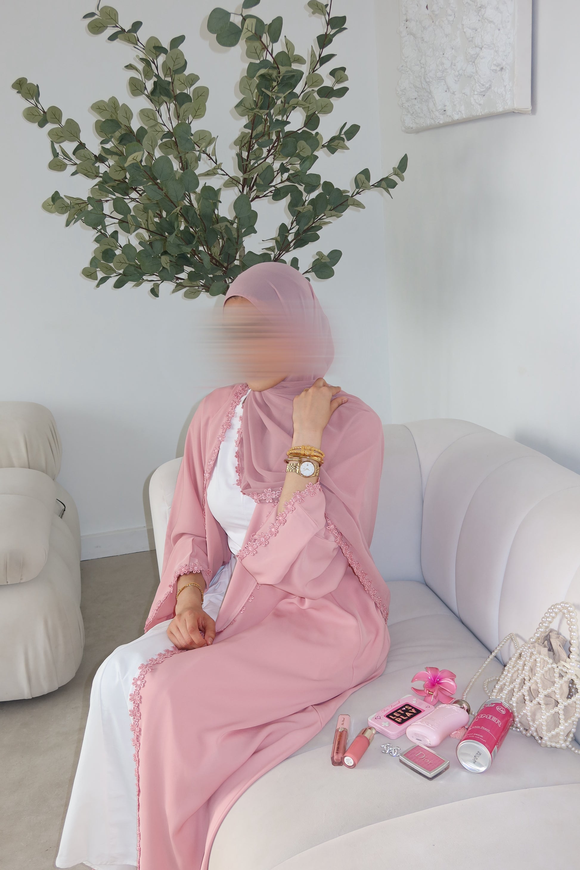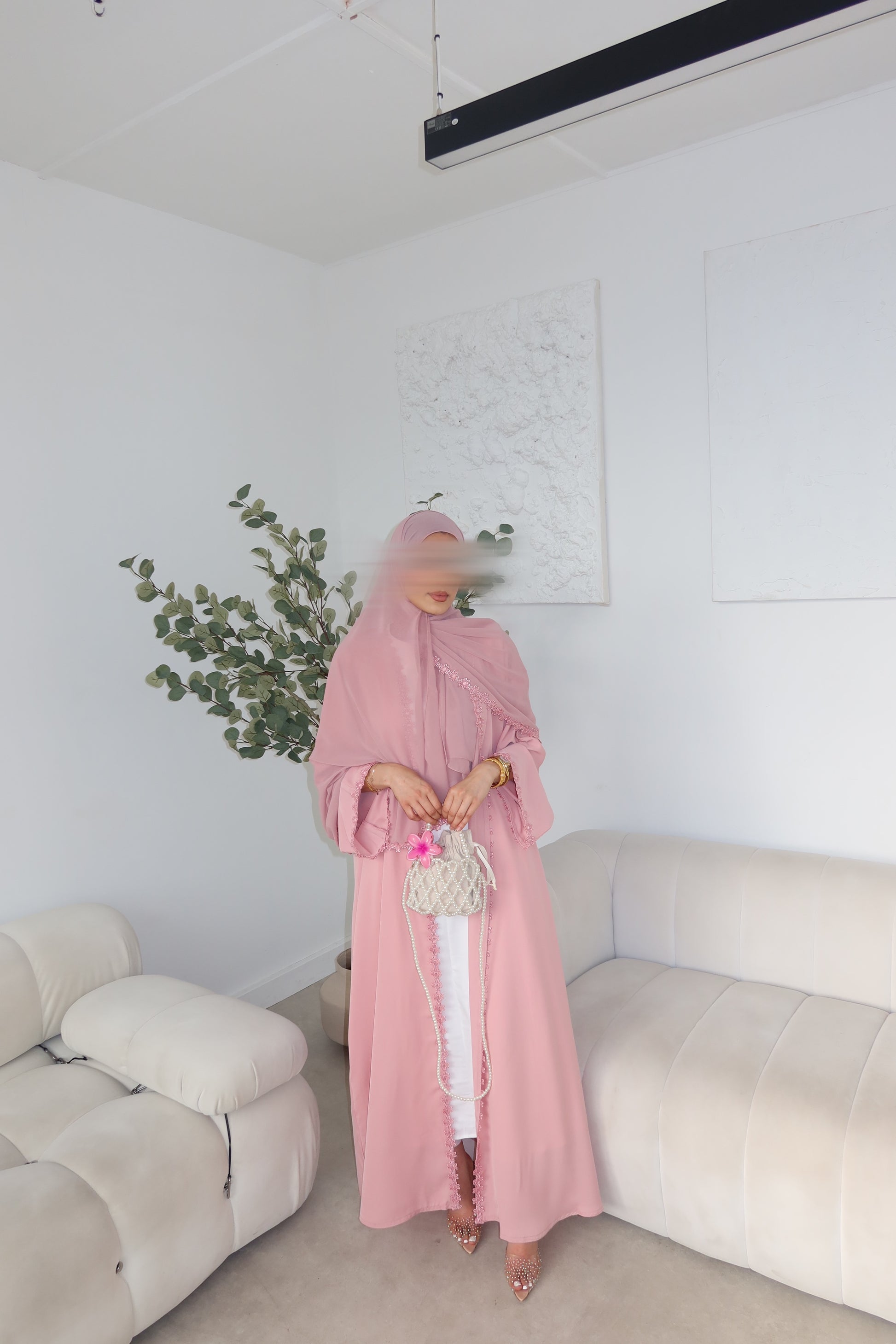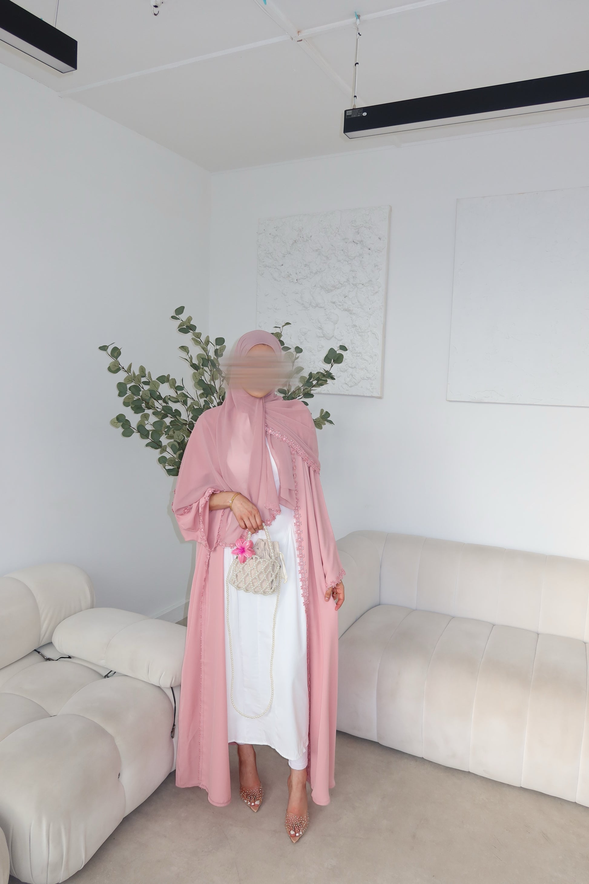 Soft, graceful, and effortlessly romantic - the Ghazal Abaya is a delicate expression of femininity. Crafted from Korean Nada fabric, it drapes beautifully with every movement, offering both comfort and elegance. Accented with floral lace details along the sleeves and hem, this abaya adds a whimsical charm to your look. Whether you're dressing for a special occasion or elevating your everyday style, the Ghazal Abaya brings a dreamy, refined silhouette that's both flattering and timeless.
